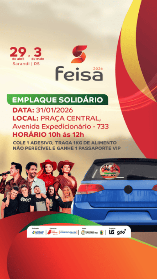 No embalo da solidariedade, é simples e cheio de sentido: cole 1 adesivo em seu carro, traga 1kg de alimento não perecível e ganhe 1 passaporte VIP para viver a FEISA 2026 entre os dias 29 de abril e 03 de maio, no Parque de Exposições Pedro de Marco.